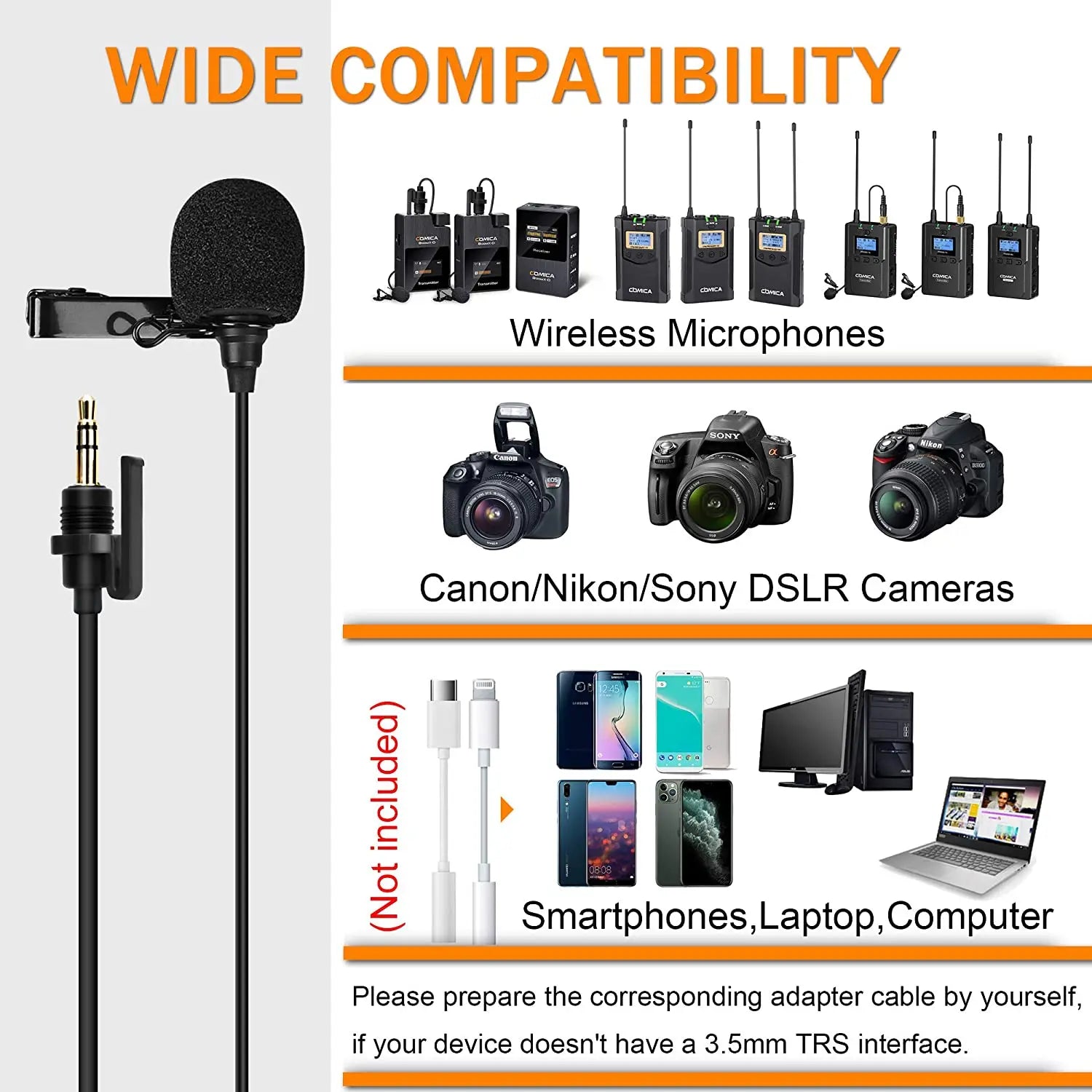 【WIDE COMPATIBILITY】The Comica CVM-SM-O1 is a lavalier microphone with a 3.5mm TRS interface, compatible with Canon Nikon Sony DSLR cameras, Comica BoomX-D series mics, Sennheiser, and other wireless Transmitters. With a TRS to TRRS Adapter Cable, the mic can be used on iPhone, iPad, laptops, and more devices with a 3.5mm interface.