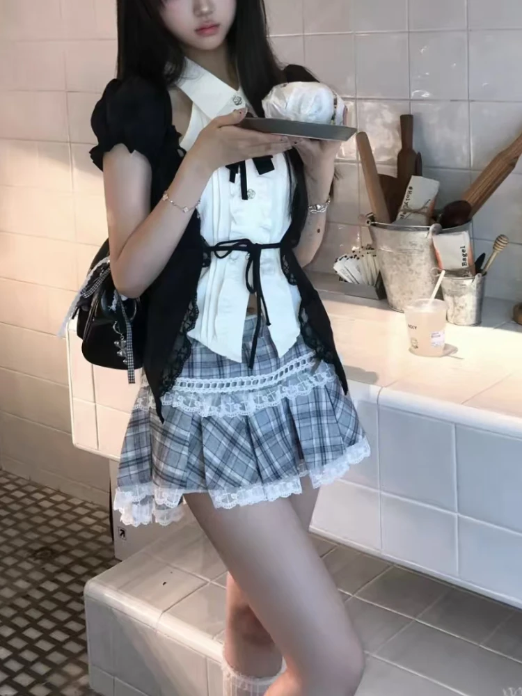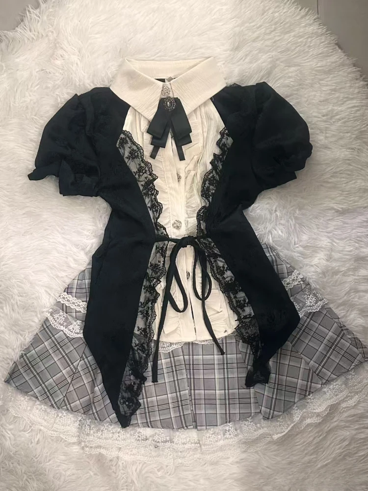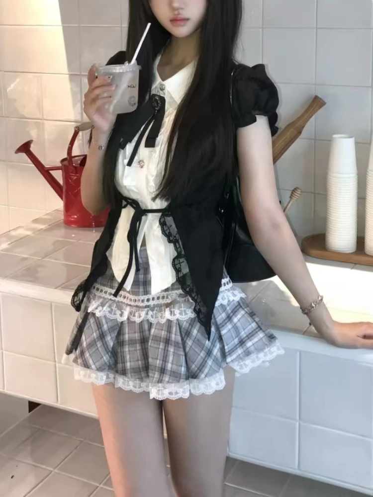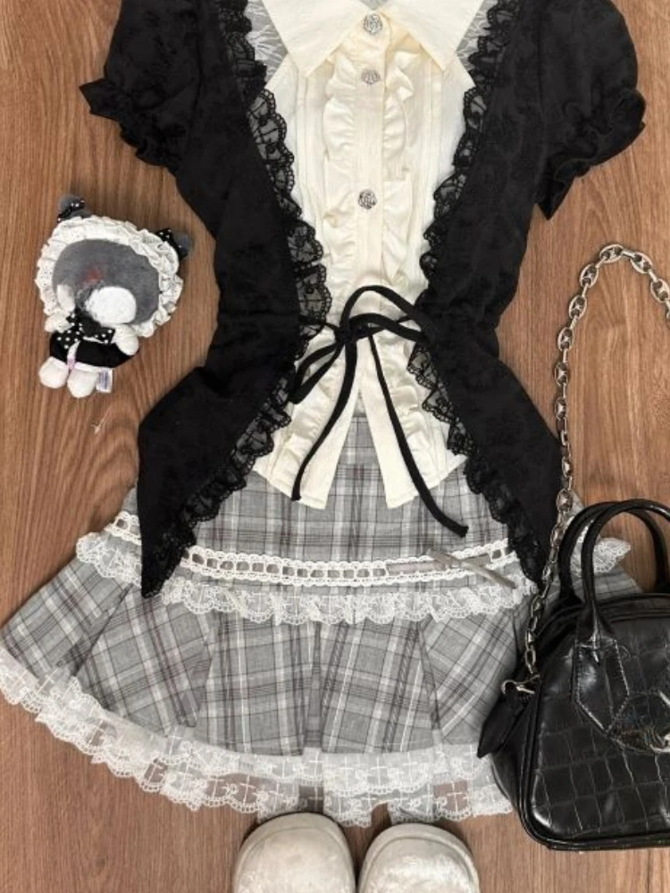Fashion Sweet Lace Short Sleeve 2 Piece Set Women Design Chic Lapel Bow Patchwork Tops + High Waist Slim Plaid Short Skirt New