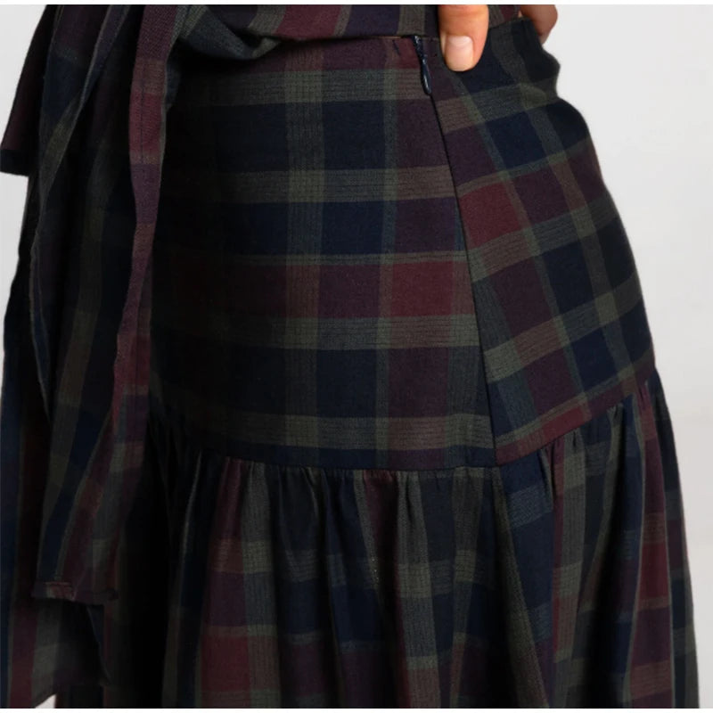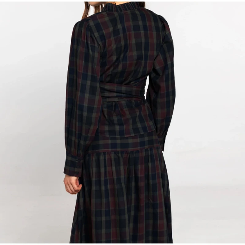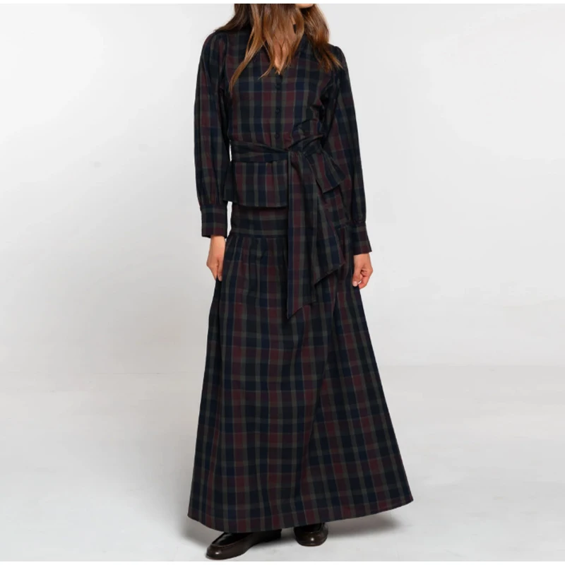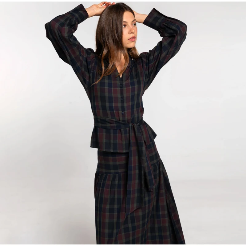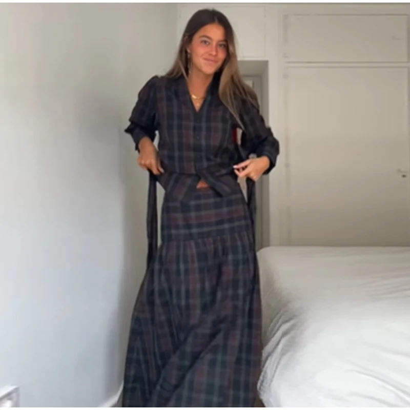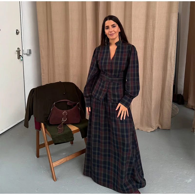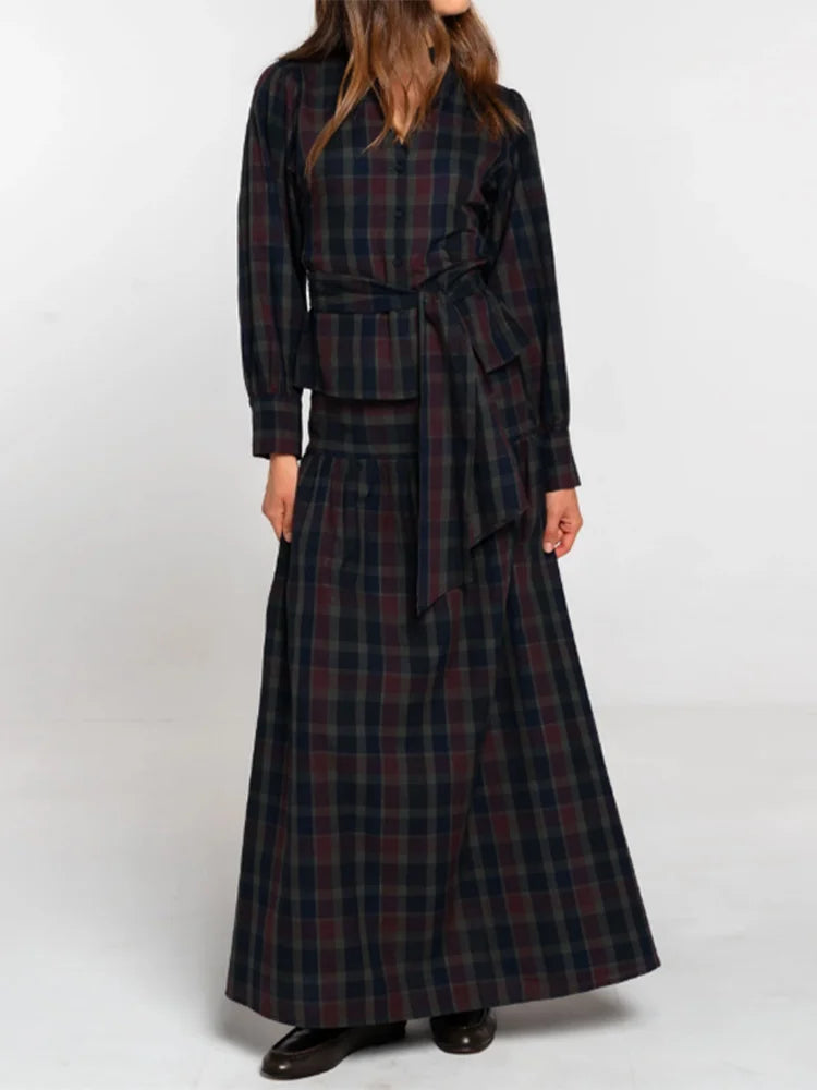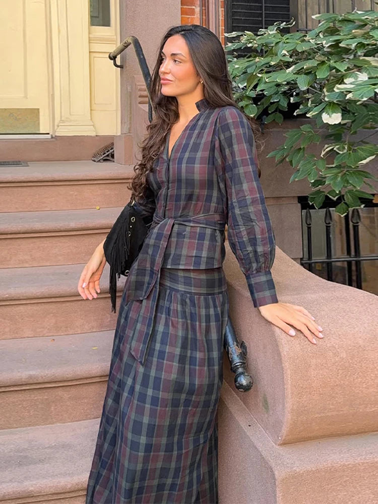 Women Chic Lace Up Checkered Skirt Suit Elegant V-neck Long Lantern Sleeve Top Long Skirts Set 2026 Spring Lady Commute outfits