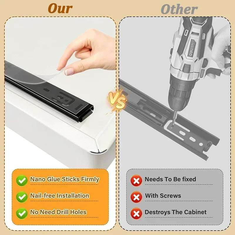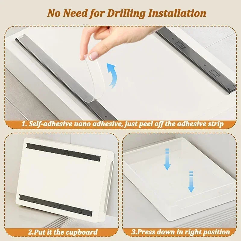 1. Easy to install: Our pull-out cabinet organizer is different from other sliding out drawers in that it does not require drilling or nailing, just stick the drawer onto the cabinet according to the manual, and installation can be completed within 1 minute.
