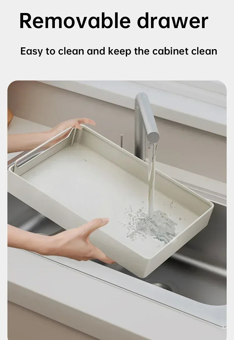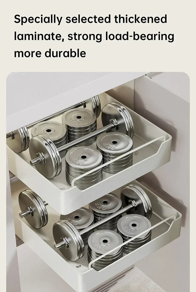3. Strong load-bearing capacity: Our pull-out cabinet storage box is made of high-quality carbon steel and coated with silver powder. A sturdy structure will provide strong load-bearing capacity, making it easy to accommodate and organize loose items.